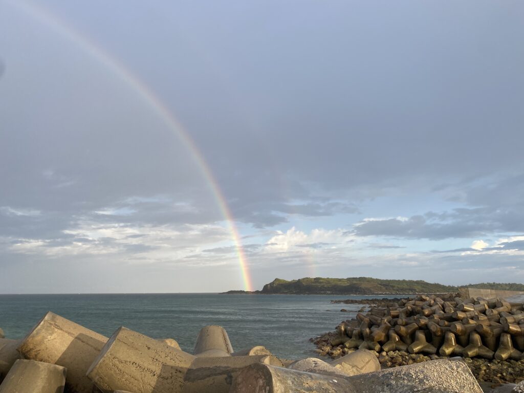 Lúc mưa ngớt thì mình ko thể chịu được nữa, xách xe đi. Điểm đầu tiên là Vịnh Triều Dương, vì nó gần chỗ mình ở, vừa đến đây thì trời lại mưa tiếp, trời sáng một góc, mây xám kéo đến 1 góc khác và mưa cũng khá nặng hạt. Đang loay hoay ko biết cứ ở lại đây hay vào chỗ nào đó trú thì mình nhìn thấy cầu vồng, mà không chỉ 1 cầu vồng, mà là cầu vồng đôi luôn! Một cầu vồng to bự, tròn trịa từ đầu này qua đầu khác và một cầu vồng khác mờ hơn ở trên nó. Đứng trước cảnh đấy thì chỉ biết lặng người mà ngắm thôi. Nhưng đồng thời, khi ngắm cầu vồng thì một nỗi buồn cũng xen vào. Một khung cảnh đẹp đẽ như thế này, với cầu vồng đôi trên cao, biển và mũi đất trước mắt nhưng mình lại không có ai ở cạnh để chia sẻ cùng thì thật là buồn biết bao. Có lẽ, ta chẳng thể mong đợi có được tất cả từ cuộc đời…