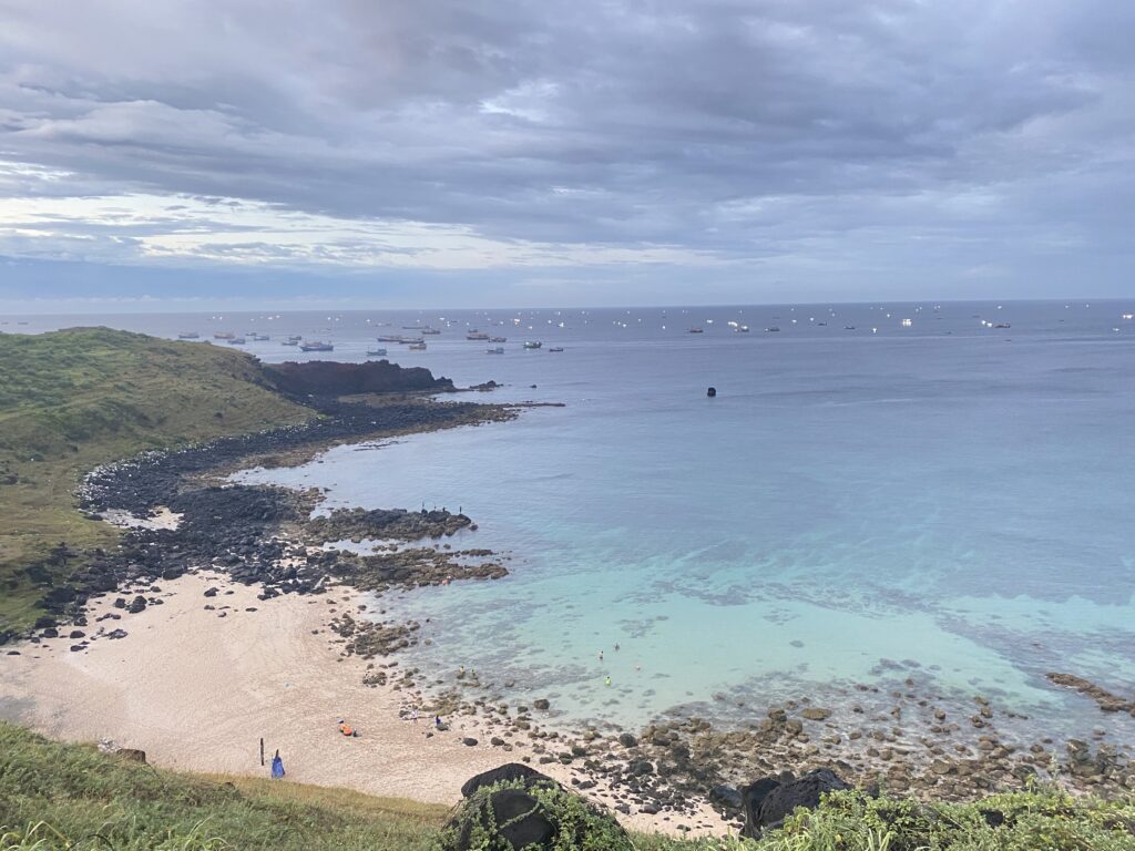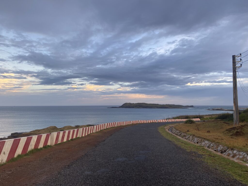 Cuối cùng thì mưa cũng tạnh và cầu vồng tan biến, mình chạy xe một đoạn nữa là đến dốc Phượt, đoạn dốc mà bạn có thể thấy biển và mũi đất ở một bên trông rất thơ mộng. Ở chỗ này, mình nhờ được 2 anh người dân bản địa, đi ra đây lấy hàu chụp hộ mấy pô ảnh 😄 Mấy anh cũng nhiệt tình ghê. Từ dốc Phượt, đi lên một đoạn nữa là đến cột cờ Phú Quý, ở đằng sau cột cờ là khung cảnh rất đẹp, bạn có thể nhìn thấy mũi đất một bên và bãi Nhỏ một bên. Lúc mình đến đây cũng có mỗi một mình nên nhìn ngắm một lúc thì mình đi tiếp vì trời cũng gần tối rồi. Ngay gần cột cờ là đường xuống bãi Nhỏ, là một bãi tắm với hai bên là đá bao bọc. Tắm ở đây chắc cũng thích phết đấy mà mình ko mang theo đồ và trời cũng gần tối nên mình cũng chỉ ngắm cảnh rồi sau leo lên và đi về. Kết thúc ngày đầu tiên ở đảo, vì ăn trưa muộn mà lại còn ăn quá no nên bữa tối mình bỏ qua, định tìm hàng ăn vặt gì đấy nhưng mà không biết đường nên đành thôi.