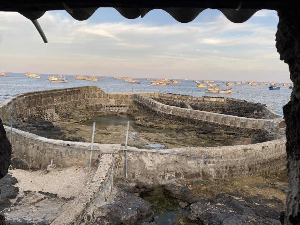 Hòn Tranh thì về cơ bản chỉ có vậy thôi, hòn đảo nhỏ nên đi tour đi đảo gói gọn chỉ trong 3h, đến trưa là về lại đảo Phú Quý rồi. À quên, đi cano ra đảo mất 250k, còn thuê thêm tour guide dẫn đường đi quanh đảo với chụp choẹt cho thì thêm tiền cho tour guide nữa nhé, ban đầu mình cứ tưởng 250k là tất cả , nghĩ sao rẻ thế 🥲 . Trưa nay thì mình đi ăn ở quán Lưới SeaFood. Đồ ăn cũng khá ngon mà mình lại gọi quá nhiều đồ nên ăn không hết, haizz. Ăn xong mình về ngủ đến chiều luôn! Tầm chiều thì mình chạy xe tới chỗ Mộ Thầy. Ở đằng sau Mộ Thầy là chỗ người ta nuôi tôm nên họ xây cái hồ trông khá là hay, người dân họ cũng thân thiện nên bảo là họ cho mình vào xem à. Ngoài ra thì từ đằng sau Mộ Thầy còn có đường ra chỗ Mũi Đất, ở đây khung cảnh rất là đẹp, với mặt trời lặn một bên và hồ nuôi cá một bên , ngắm cảnh ở đây rất là thích và gió mát nữa. Mình ở đây đến tận lúc gần tối mới về.