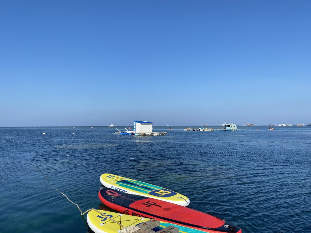 Đến gần trưa thì mình về lại chỗ trung tâm đảo ăn ở quán Thuận Phát tiếp rồi quay về khách sạn nghỉ. Đến lúc này tour guide của mình nó mới lại liên lạc lại bảo hẹn đi tour buổi chiều. Mình cũng ức vụ buổi sáng lắm mà nghĩ chiều ko đi tour cano thì chả biết đi đâu thế là chiều tầm 3h lại đi tour cano. Lần này thì tour guide nó lại đến đón cho đỡ lạc trôi như buổi sáng. Bình thường đi tour cano trèo thuyền sup ngắm san hô thì mọi người hay đi buổi sáng vì nước lên cao, buổi chiều, nước xuống thấp cano họ không vào được. Vì cano không vào được, nên là tour guide họ sẽ trở mình bằng thuyền sup đến tận chỗ để chơi luôn! Chỗ ấy là một cái bè nổi mà từ đấy bạn có thể lặn ngắm san hô hoặc trèo thuyền sup. Sau khi chụp 7749 kiểu ảnh cho mọi người trong tour thì mọi người cũng lục đục xuống biển để bơi lội và ngắm san hô. Lần đầu đi tắm biển trong suốt cả chuyến đi biển 1 tuần của mình 🤣 Mà thích phết. Mình phải mặc áo pháo nên chỉ có thể đeo kính úp mặt ngắm thôi chứ không dám lặn xuống nhưng mà bơi ở biển một lúc thấy thích cực kỳ. Lúc này trời cũng dịu rồi nên không còn thấy nắng chói chang nữa, biển cũng êm và nước mát nên là tắm biển rất thích. Ở đây có cái hay là vì nước xuống thấp nên là có chỗ bạn chạm được vào rặng san hô luôn, thậm chí có chỗ ở xa xa chỗ mình, san hô nó nhô lên khỏi mặt nước luôn. Kết quả là nếu bơi gần chỗ ấy là bạn có thể đứng lên đấy luôn. Nó cứng như đá vậy nên mình cũng không biết là đấy là san hô sống hay chết nữa, nhưng nếu bơi loạng quạng va phải chân tay ở đấy thì cũng có khi sước sát chân tay đấy.